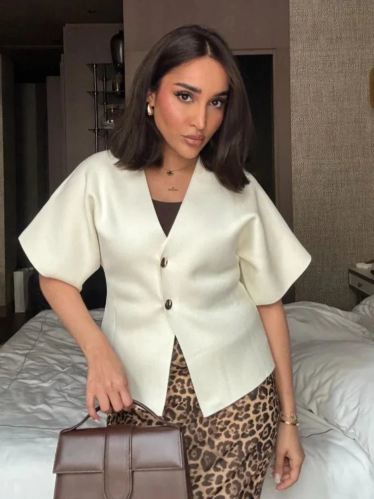 Bringen Sie Stil in Ihren Alltag mit der Alba Zweiknopf-Bluse. Perfekt für Freizeit oder Büro, bietet sie Komfort und Eleganz.