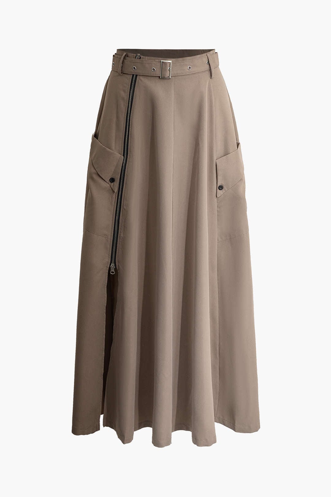2. Fließender Maxirock mit Utility-Details – Elegante Lässigkeit trifft auf funktionale Taschen und Zierreißverschluss.