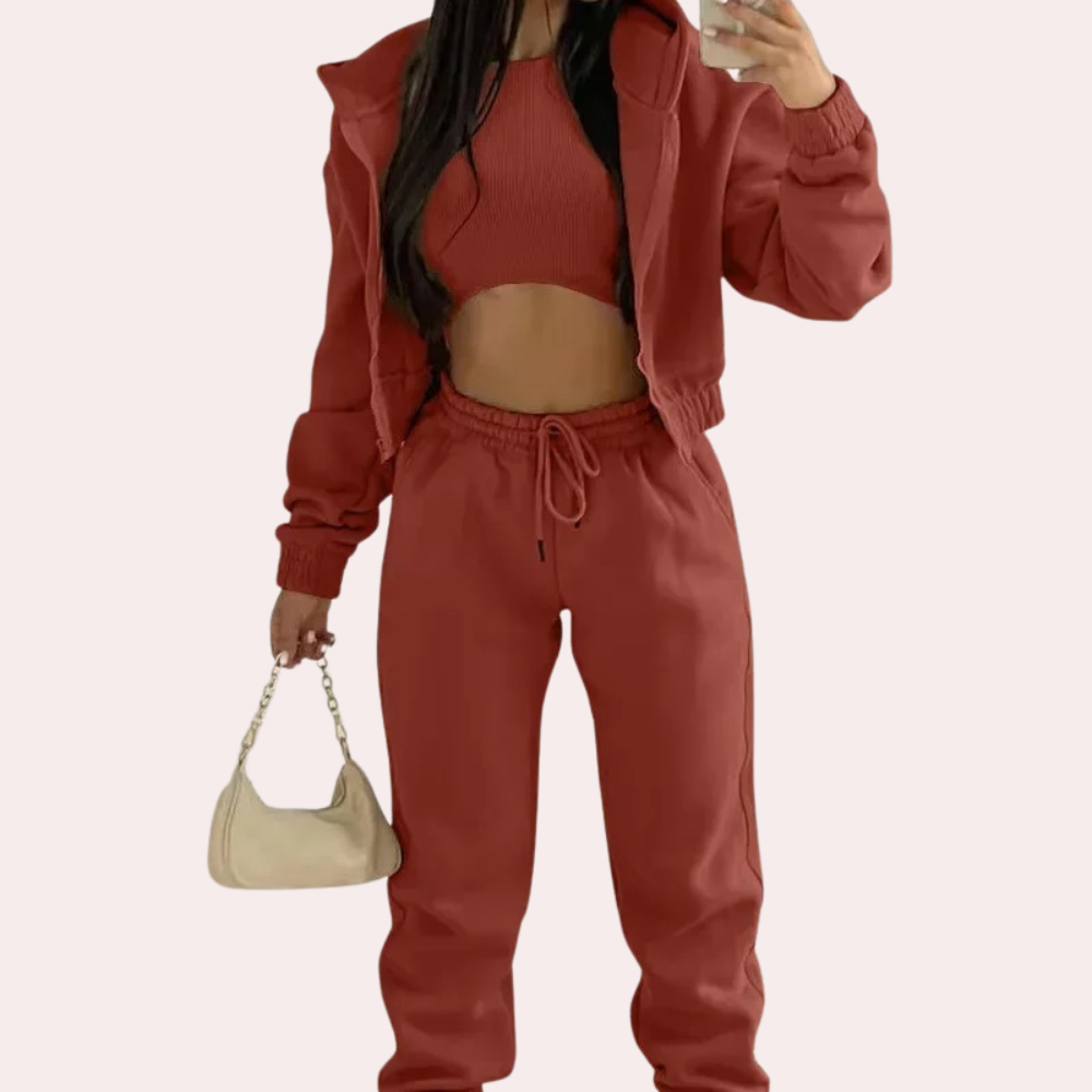 Das 3-teilige Set Bella Comfortable für Damen ist perfekt für jede Gelegenheit. Ob Sie einen Tag im Freien verbringen oder sich drinnen entspannen, dieses Set bietet den Komfort eines Trainingsanzugs mit einem modischen Twist.