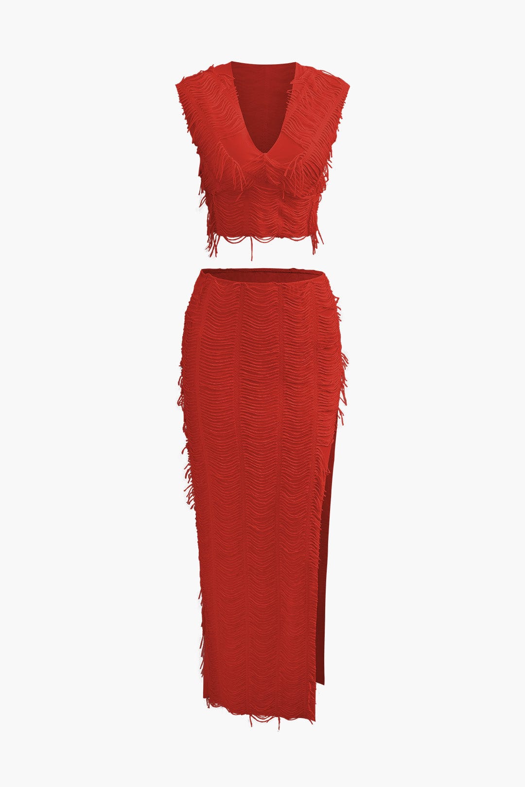 Der Charlene Fransen-Zweiteiler ist ein atemberaubendes Ensemble, das Stil und Dynamik vereint. Das ärmellose Top mit V-Ausschnitt sorgt für eine feminine Note, während der figurbetonte Rock mit seitlichem Schlitz und langen Fransen eine elegante Bewegung verleiht. Perfekt für besondere Anlässe, Partys oder sommerliche Abendveranstaltungen.