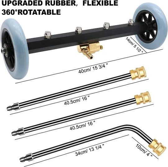 - Benutzerfreundliche Einrichtung: Befestigen Sie die gerade Verlängerungsstange am Unterbodenreiniger, schließen Sie die gebogene Stange an und stellen Sie ganz einfach eine Verbindung zu Ihrer Hochdruckreinigerpistole her.