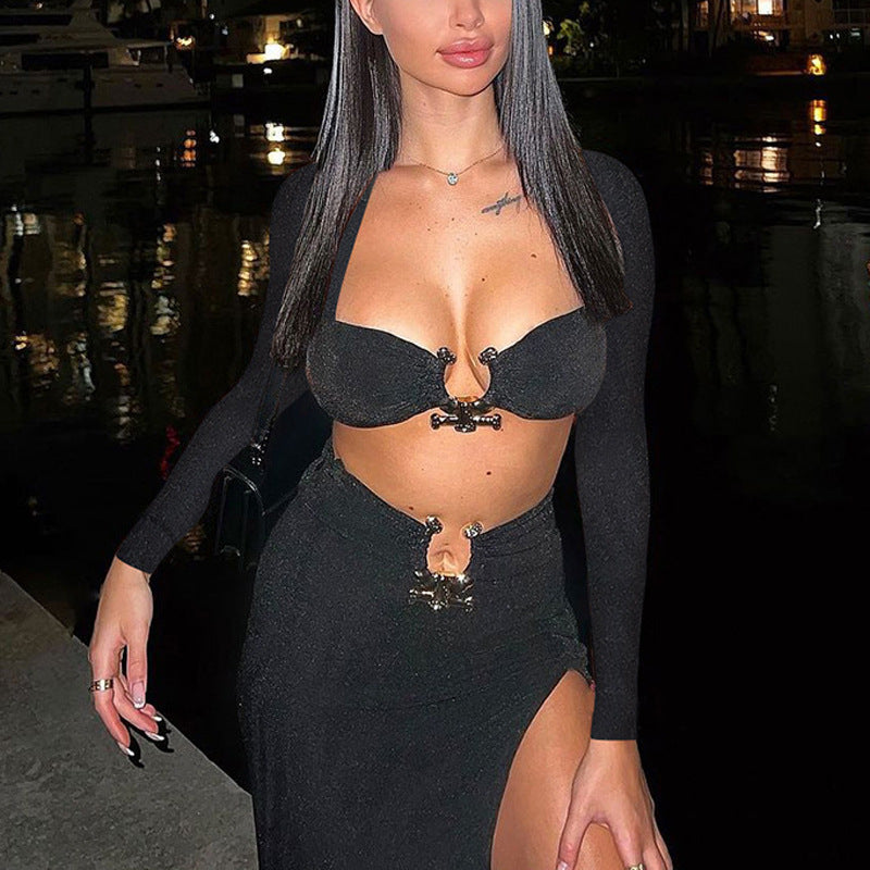 Entdecken Sie unser stilvolles Damen Crop-Top mit langen Ärmeln und einem einzigartigen dekorativen Clipp-Verschluss. Dieses modische Oberteil ist ideal für nächtliche Ausflüge oder besondere Anlässe und bietet einen faszinierenden Look, der alle Blicke auf sich zieht.