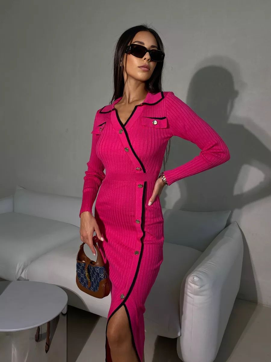 Entdecken Sie unser elegantes und figurbetontes Strickkleid, das Stil und Komfort vereint. Dieses Kleid besticht durch seine raffinierten hohen Schlitze und die dekorativen Knopfdetails, die jedem Look einen besonderen Touch verleihen.