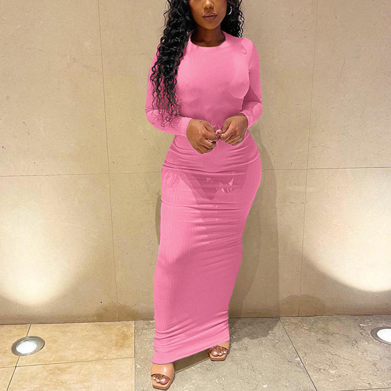 Damen figurbetontes Maxikleid mit elegantem Rundhalsausschnitt und langen Ärmeln Heidi-Mode