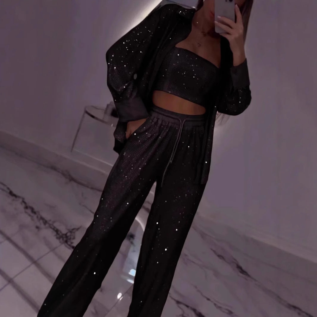 • Modisches Design: Das Set besteht aus einem eleganten, glitzernden Top und einer passenden Hose, die zusammen ein harmonisches Gesamtbild ergeben.