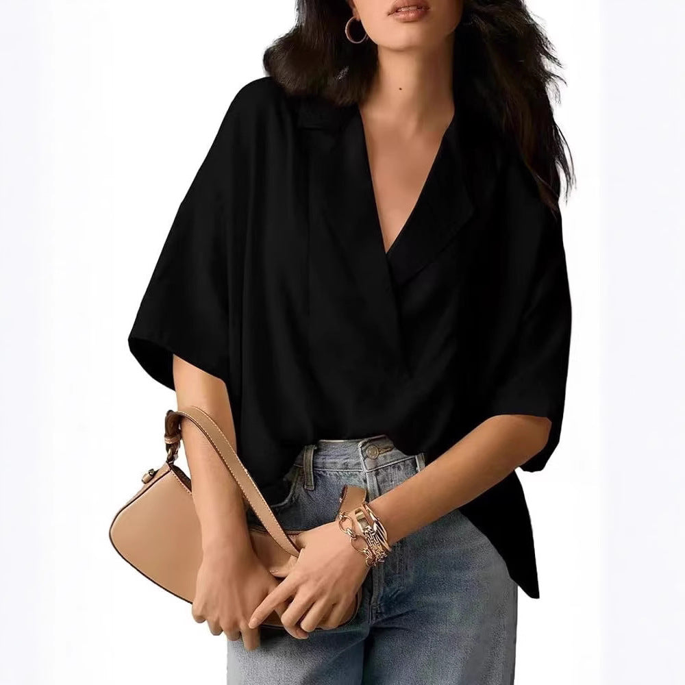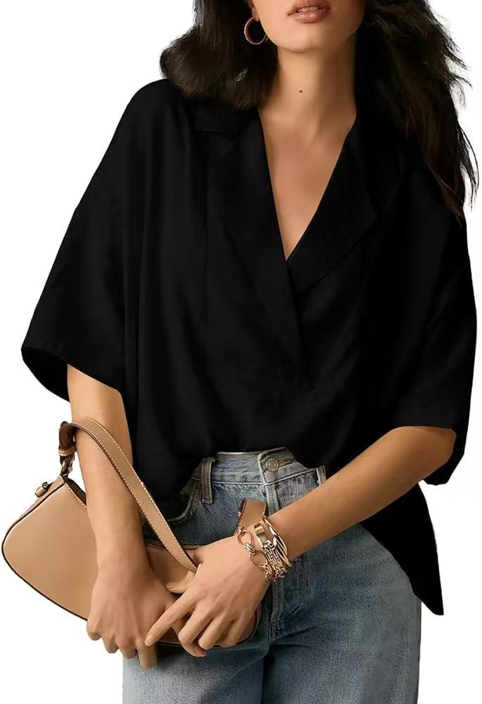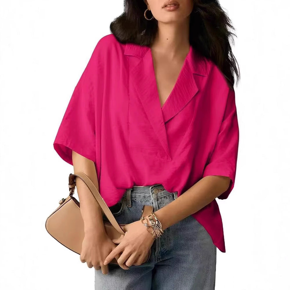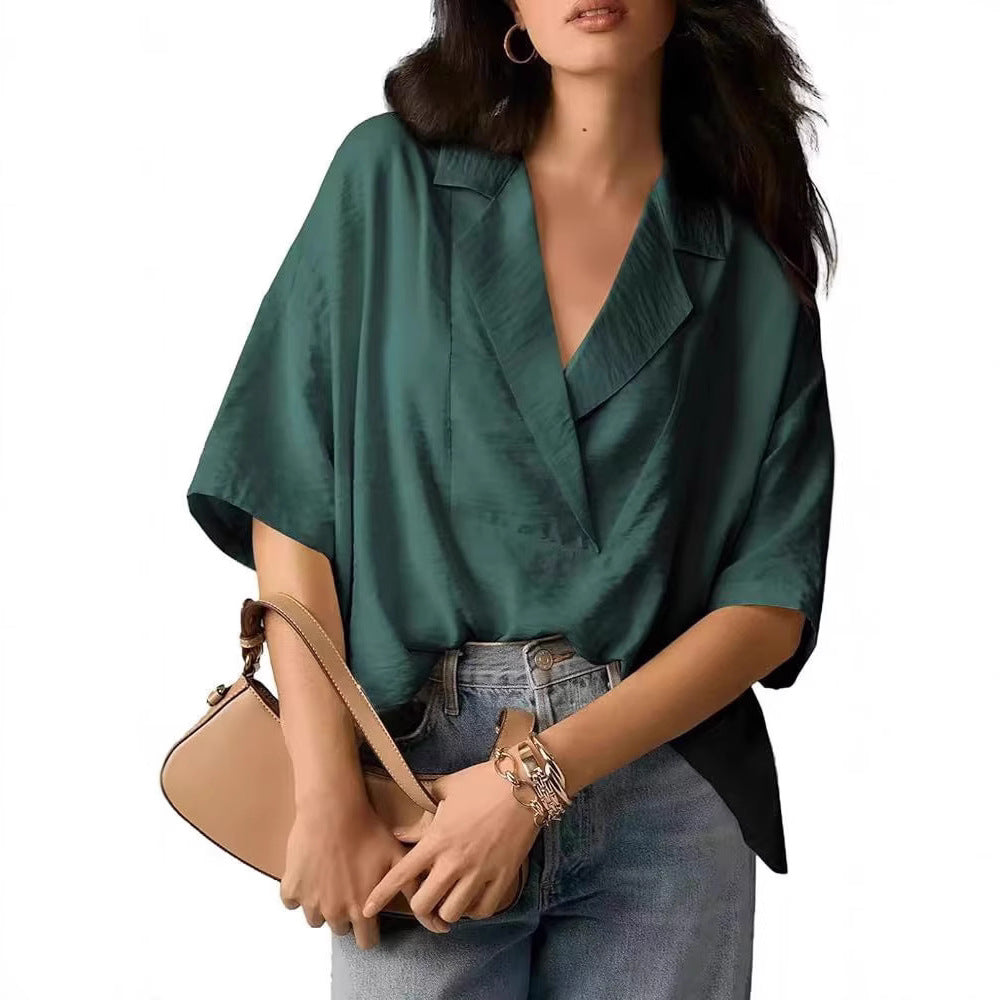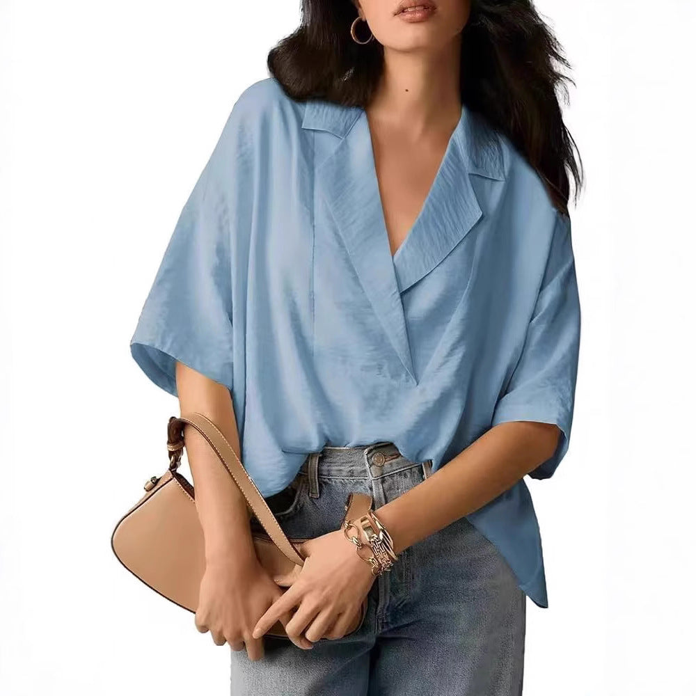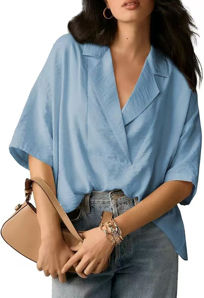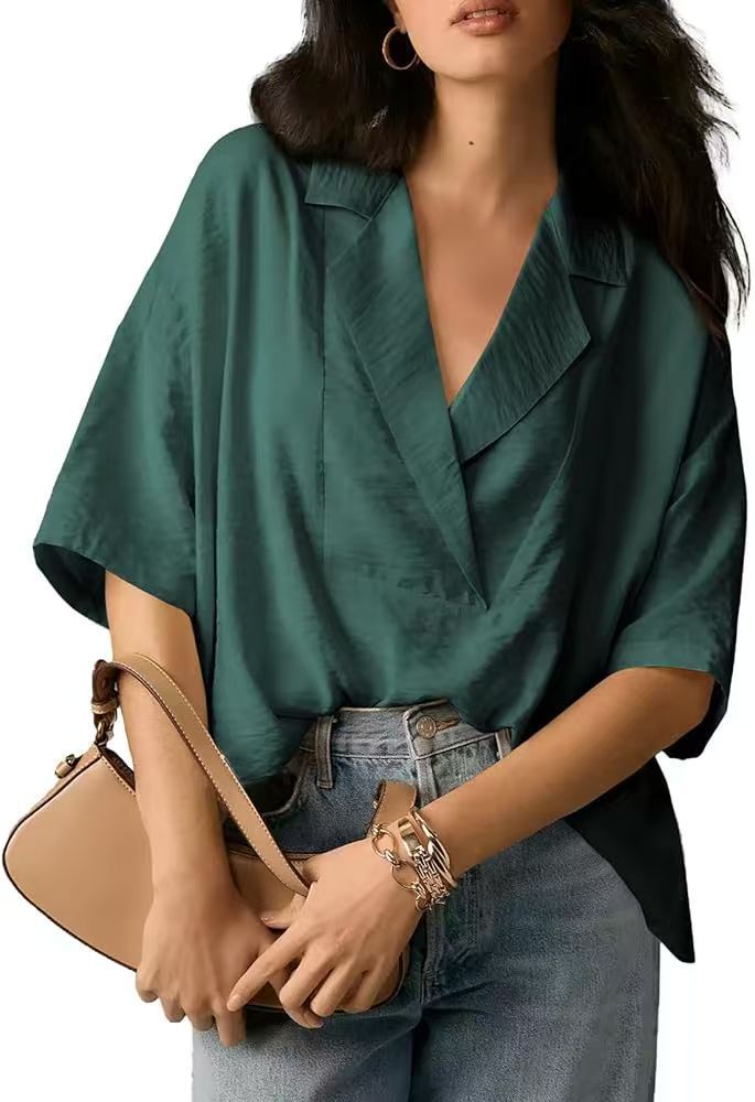 Damen lockeres und stilvolles Blusenoberteil mit V-Ausschnitt und kurzen Ärmeln Heidi-Mode