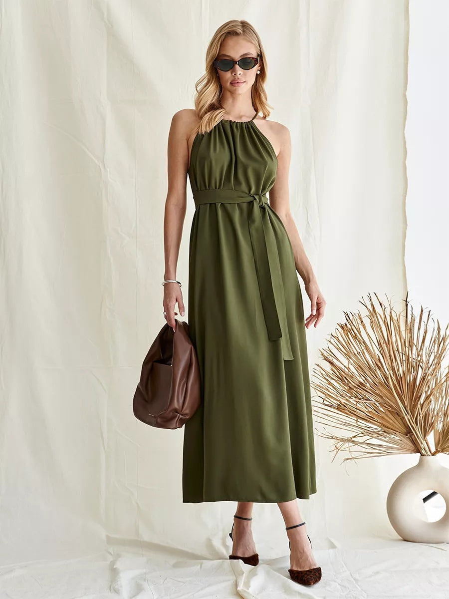 Damen Maxikleid mit gerafftem Ausschnitt und Taillengürtel Heidi-Mode
