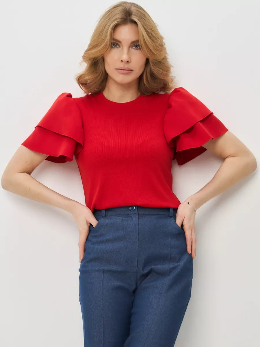 Damen Oberteil mit voluminösen Rüschendetails und feinem Rippmuster Heidi-Mode