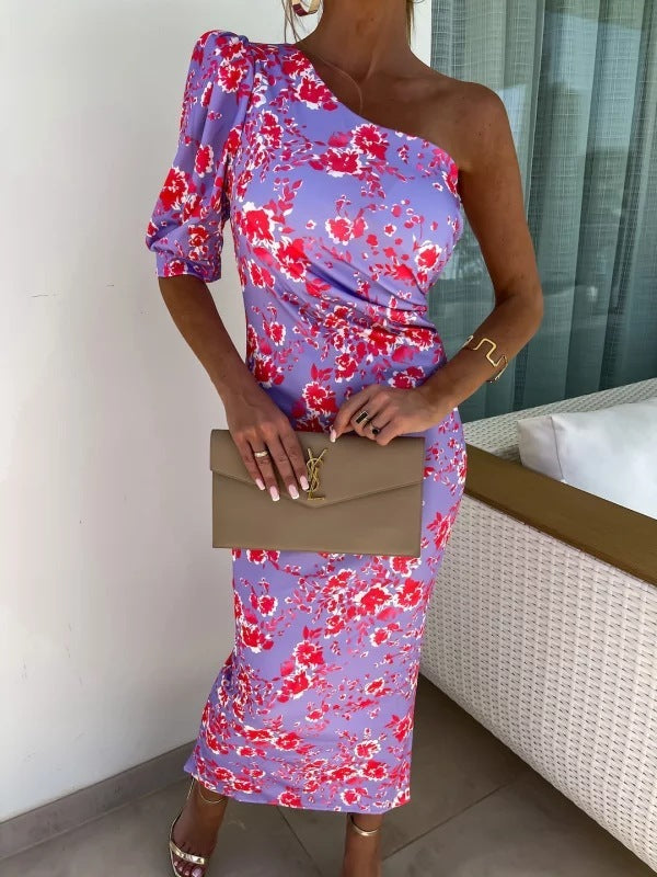 Fiona – Gedrucktes Etuikleid mit schrägem Schulterdesign