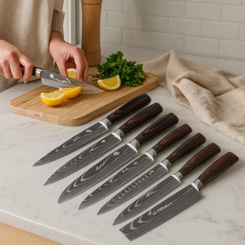 • Komplettes 8-teiliges Set – inklusive Kochmesser, Brotmesser, Tranchiermesser, Allzweckmesser, Schälmesser und mehr.