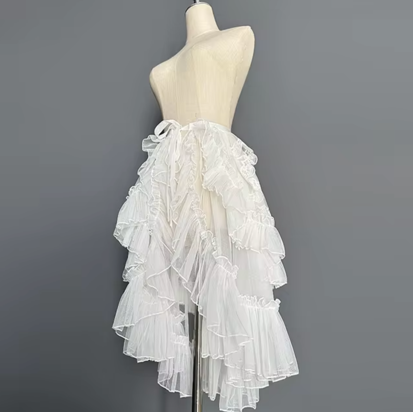 Tauchen Sie ein in eine Welt der Faszination mit unserem von der Gothic-Kultur inspirierten Partykilt, verziert mit zarter Spitze und verspielten Rüschendetails. Gefertigt aus feiner Spitze und transparentem Netz, bietet dieser Rock ein luftiges und fließendes Tragegefühl, das perfekt ist, um über Ihre Lieblingsoutfits geschichtet zu werden. Der asymmetrische Schnitt und die niedlichen Rüschendetails schaffen eine anziehende Silhouette, die Ihren mutigen Stil unterstreicht.