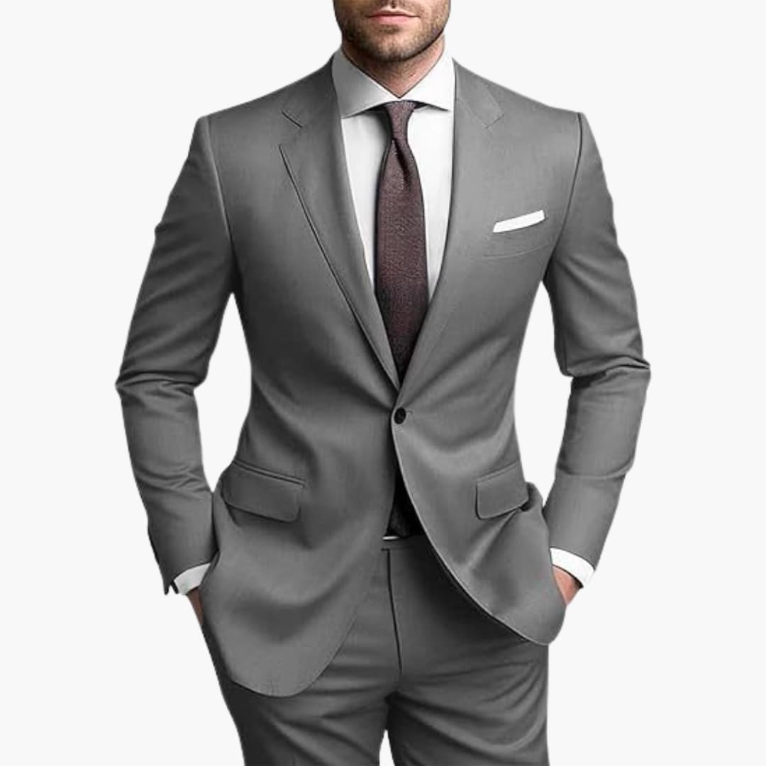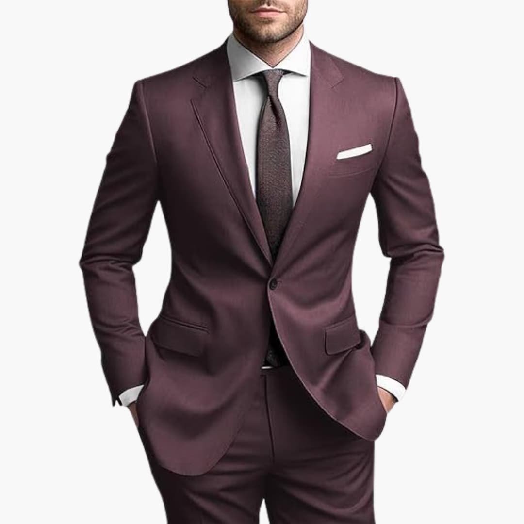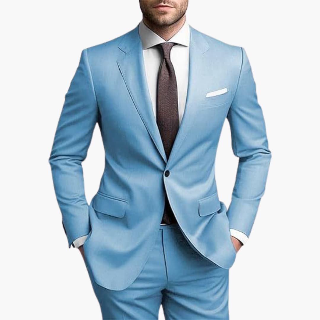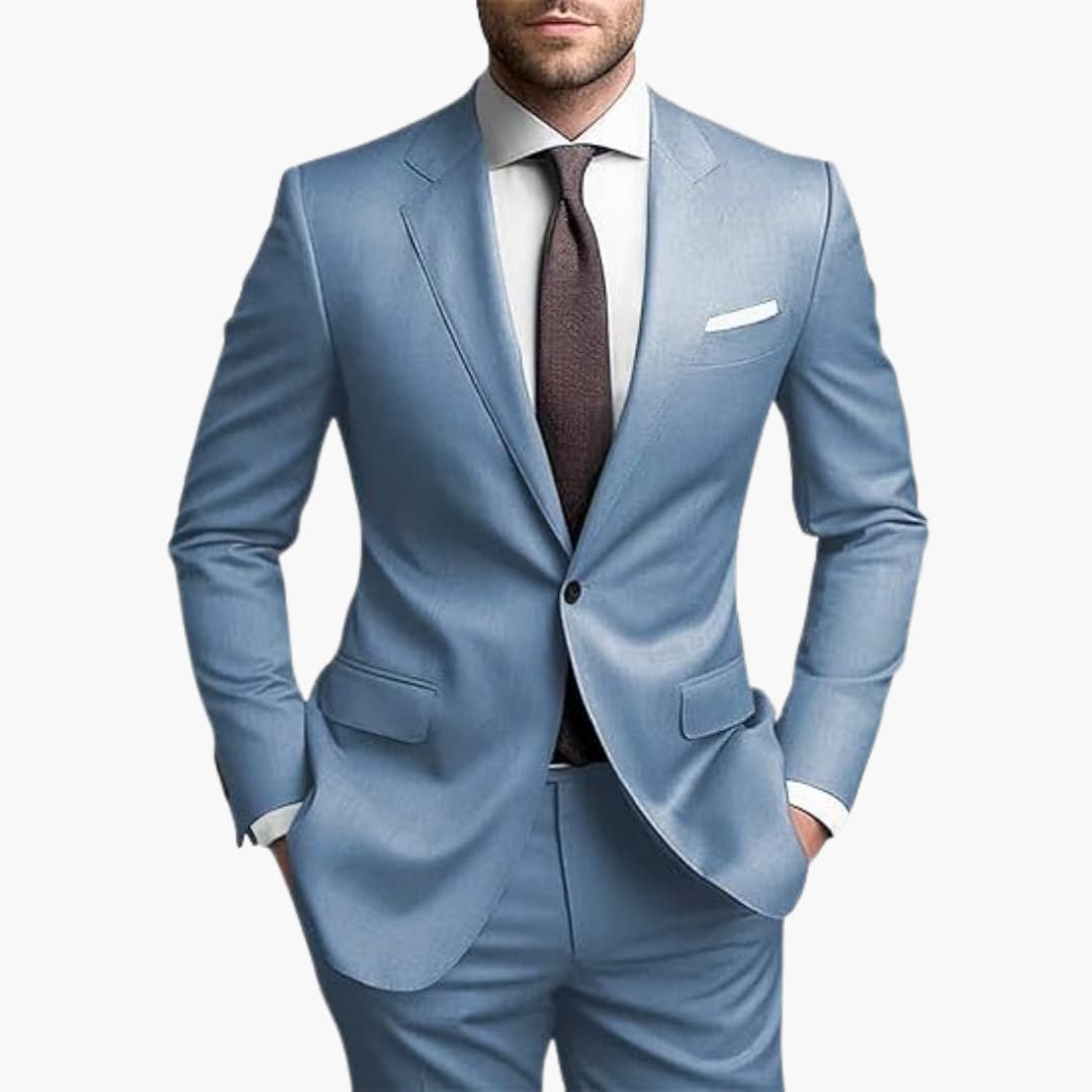 Herren Zweiteiler aus leichtem Stoff für den ganzjährigen Einsatz geeignet. Bestehend aus einem einreihigen Blazer mit langen Ärmeln, Reverskragen und Pattentaschen. Inklusive passender Hose mit schmaler Passform. Ideal für formelle Anlässe wie Hochzeiten oder Geschäftstreffen.