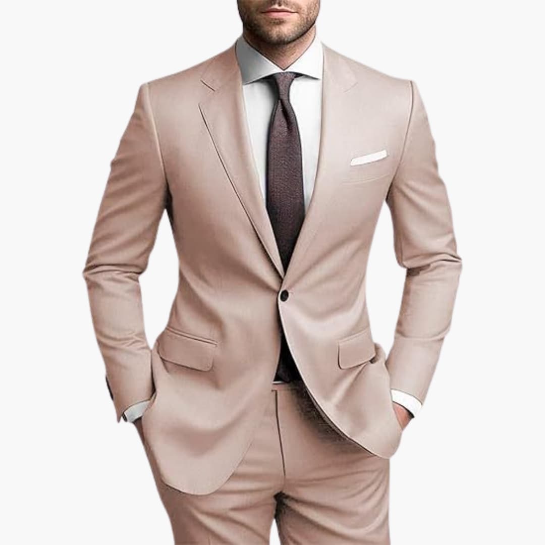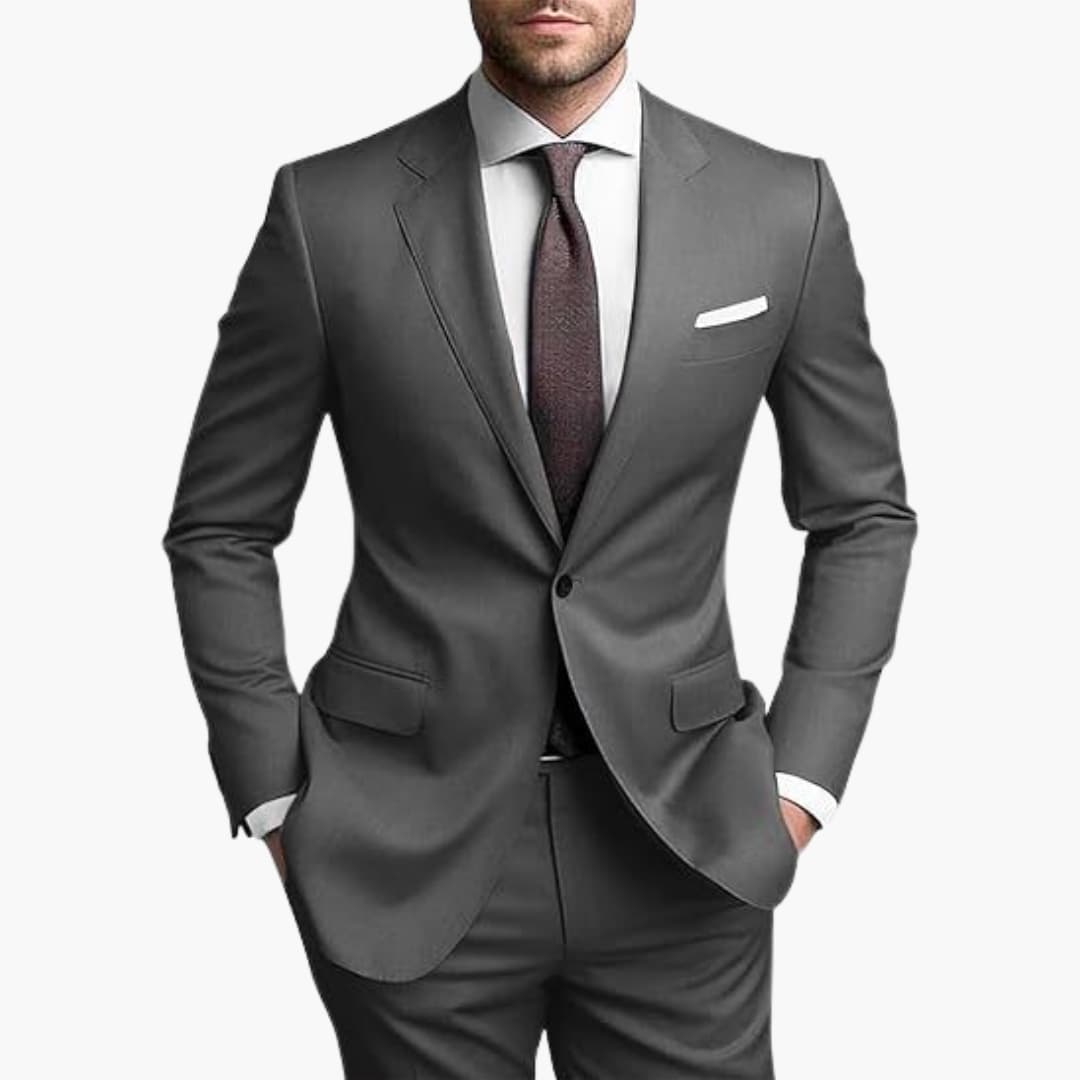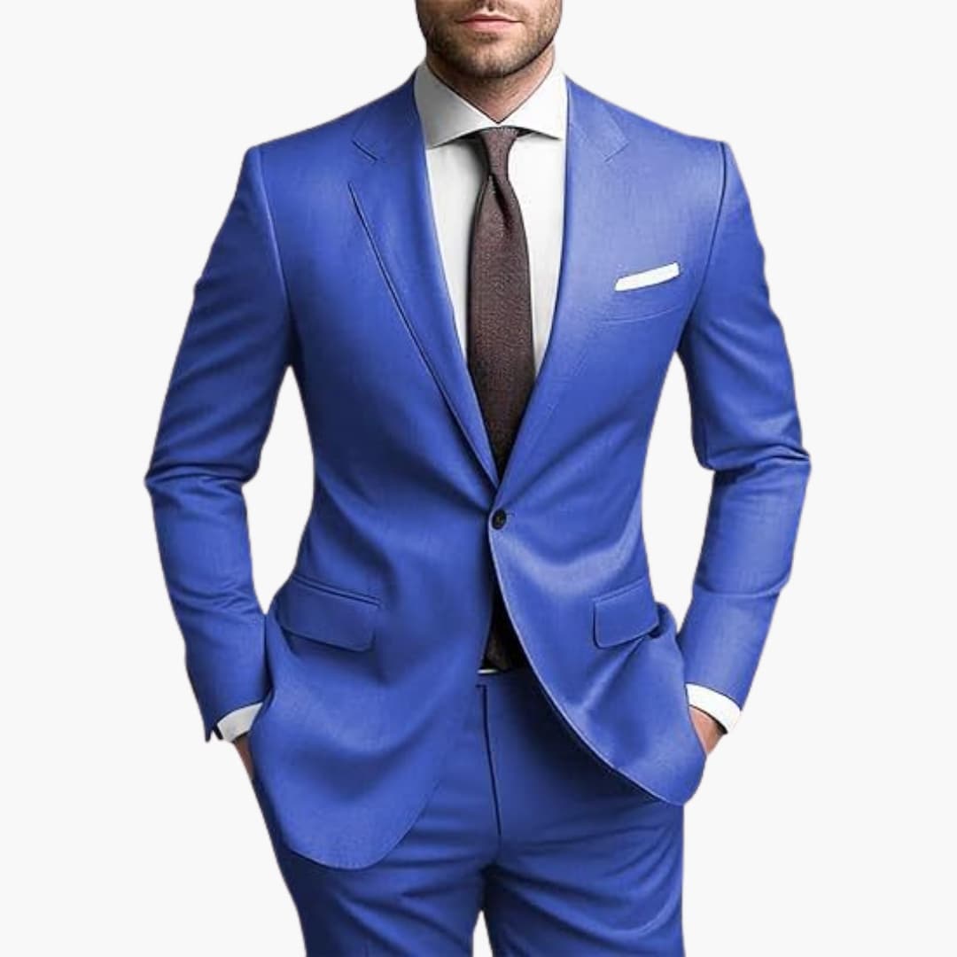 Herren Zweiteiler aus leichtem Stoff für den ganzjährigen Einsatz geeignet. Bestehend aus einem einreihigen Blazer mit langen Ärmeln, Reverskragen und Pattentaschen. Inklusive passender Hose mit schmaler Passform. Ideal für formelle Anlässe wie Hochzeiten oder Geschäftstreffen.