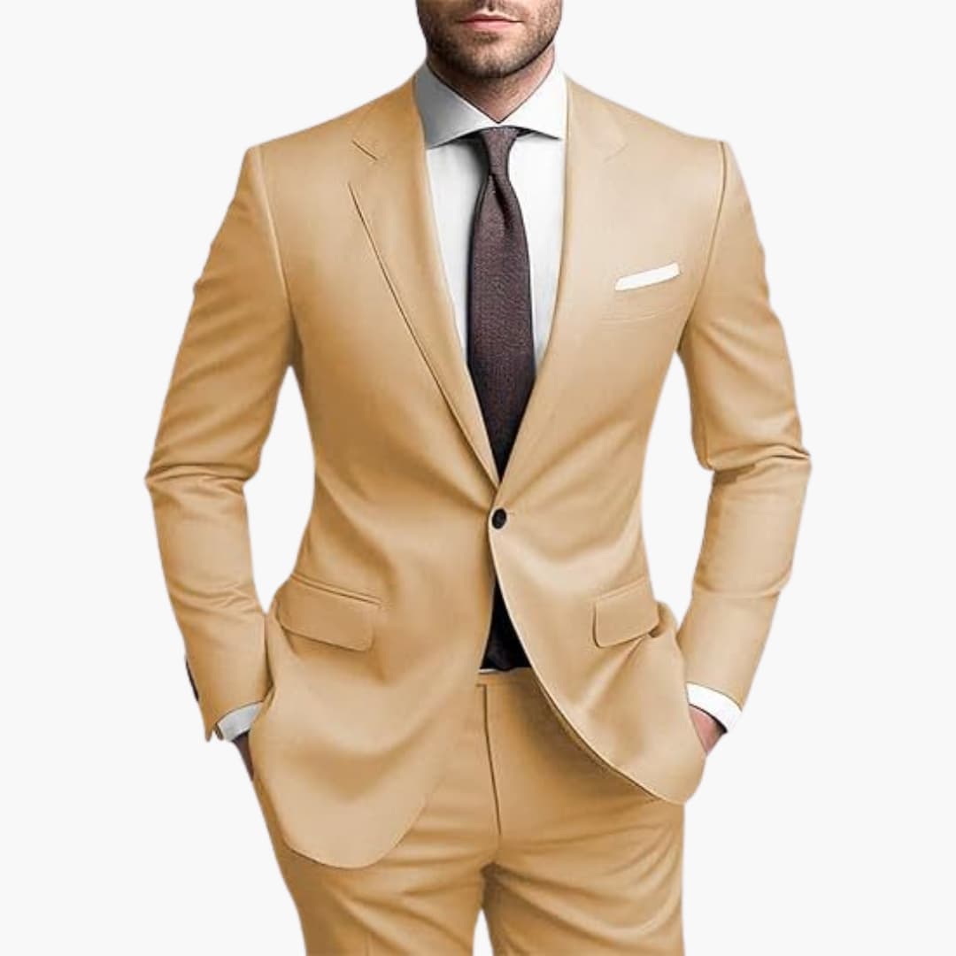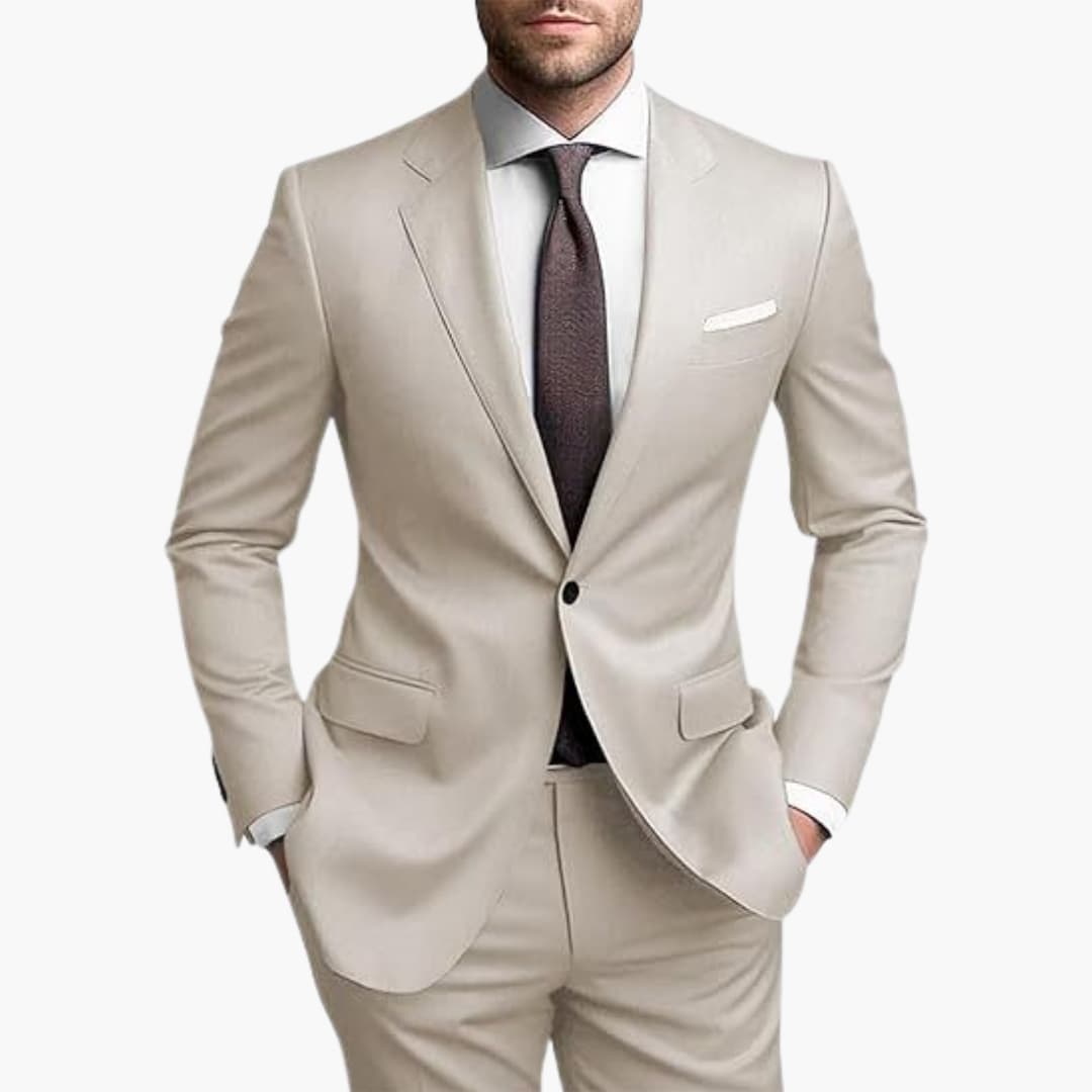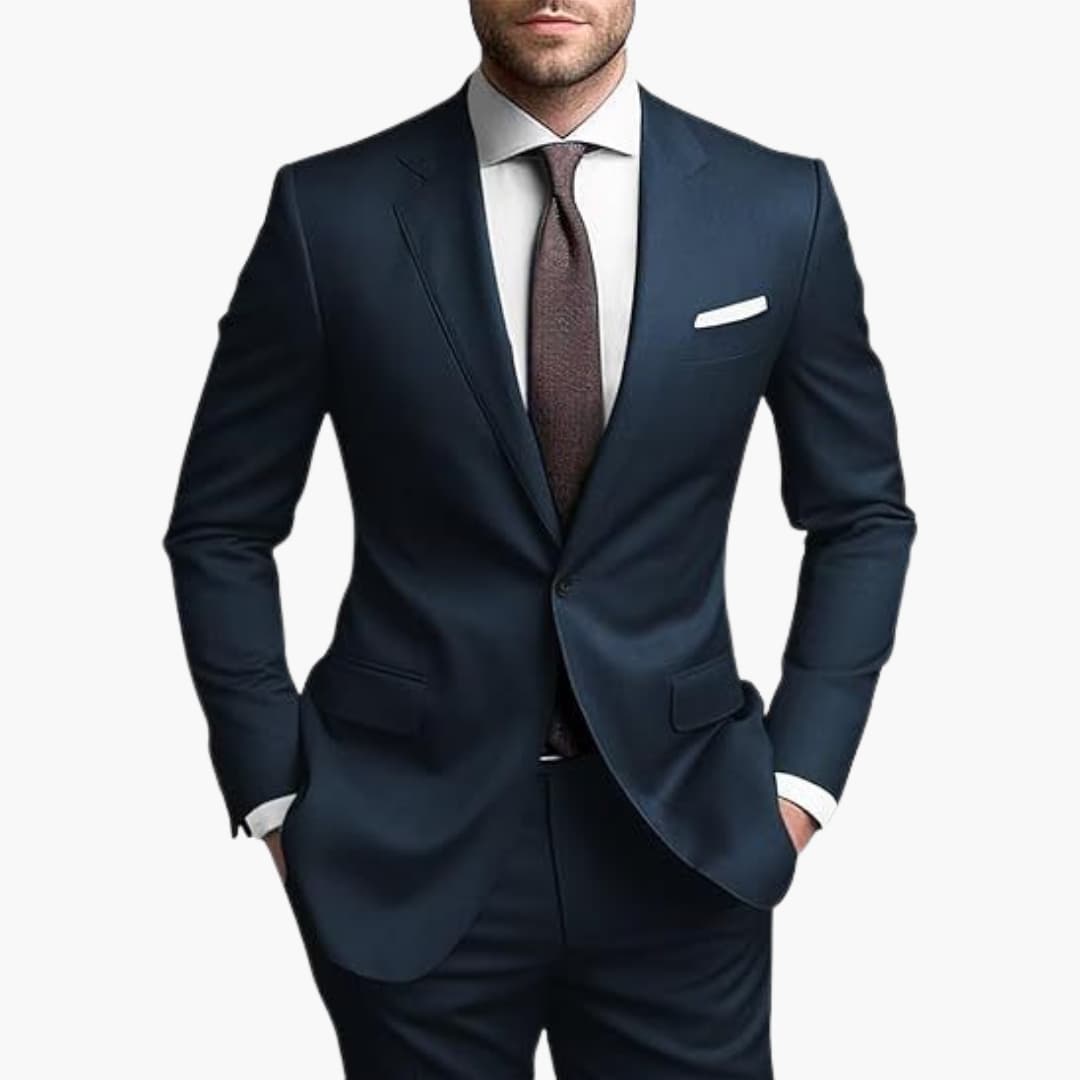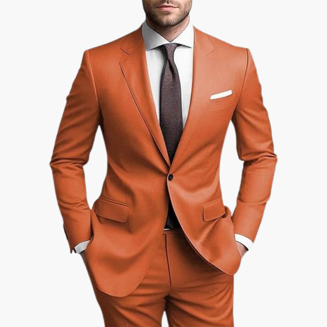 Herren Zweiteiler aus leichtem Stoff für den ganzjährigen Einsatz geeignet. Bestehend aus einem einreihigen Blazer mit langen Ärmeln, Reverskragen und Pattentaschen. Inklusive passender Hose mit schmaler Passform. Ideal für formelle Anlässe wie Hochzeiten oder Geschäftstreffen.
