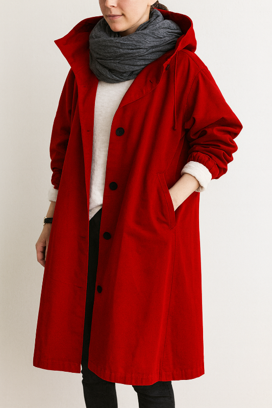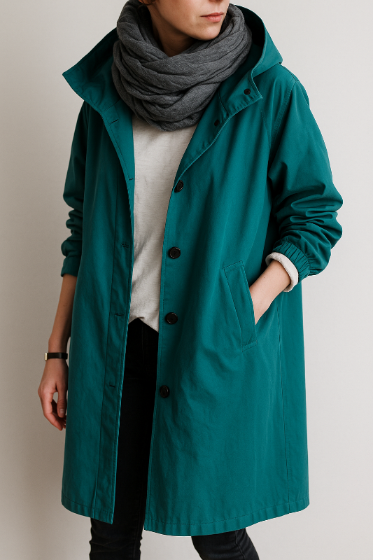Dieser lange Damenmantel präsentiert ein modernes Oversize-Design aus schützendem Material. Eine verstellbare Kapuze und elastische Manschetten unterstreichen den funktionalen Charakter. Seitentaschen und Knopfverschluss runden das klare Erscheinungsbild ab und machen ihn ideal für regnerische Tage.