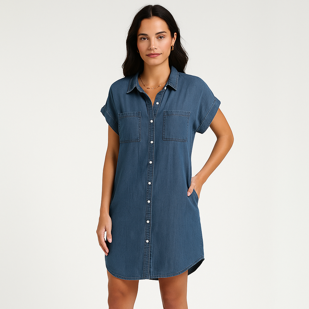 Mit durchdachten Seitentaschen für praktische Funktionalität, ohne auf Stil zu verzichten. Die taillierte, leicht geschwungene Passform betont Ihre Silhouette und bietet gleichzeitig Bewegungsfreiheit. Das schlichte Design und der weiche Denim machen dieses Kleid zum zuverlässigen Favoriten – vielseitig genug für den Lagenlook oder solo bei wärmerem Wetter.