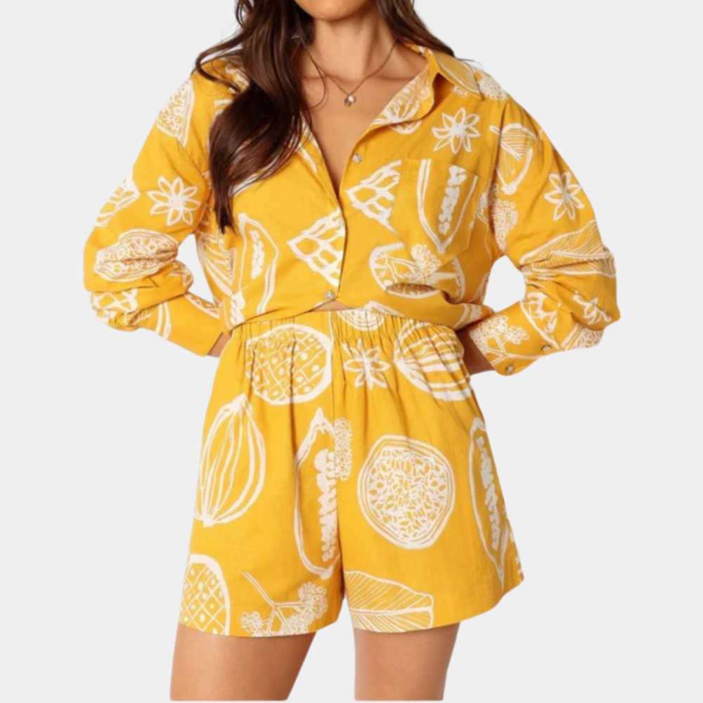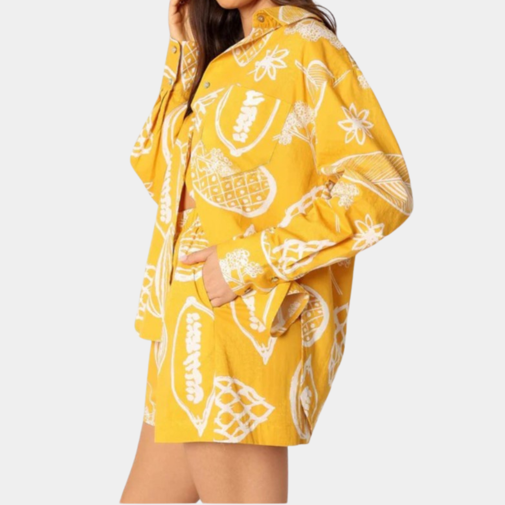 Das modische und bedruckte Damenset von Natasa ist die perfekte Wahl für einen frischen und stilvollen Look. Dieses Set besticht durch seine lebendigen Druckmuster, die jedem Outfit eine fröhliche Note verleihen. Es ist aus leichtem und atmungsaktivem Material gefertigt und bietet maximalen Komfort und Bewegungsfreiheit. Ideal für Strandtage, entspannte Wochenenden oder Sommerausflüge.