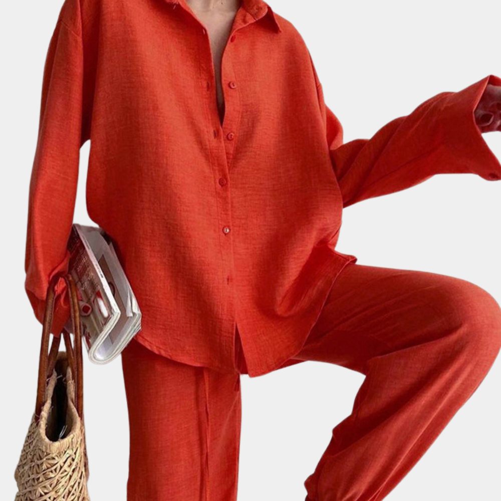 Das bequeme zweiteilige Damenset von Nera mit langem Blazer und Hose ist die perfekte Wahl. Erhältlich in den Farben Beige, Orange und Pink, kombiniert dieses Damenset Stil und Komfort für jede Gelegenheit.
