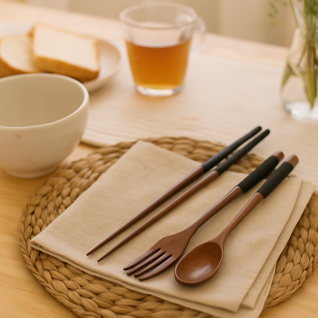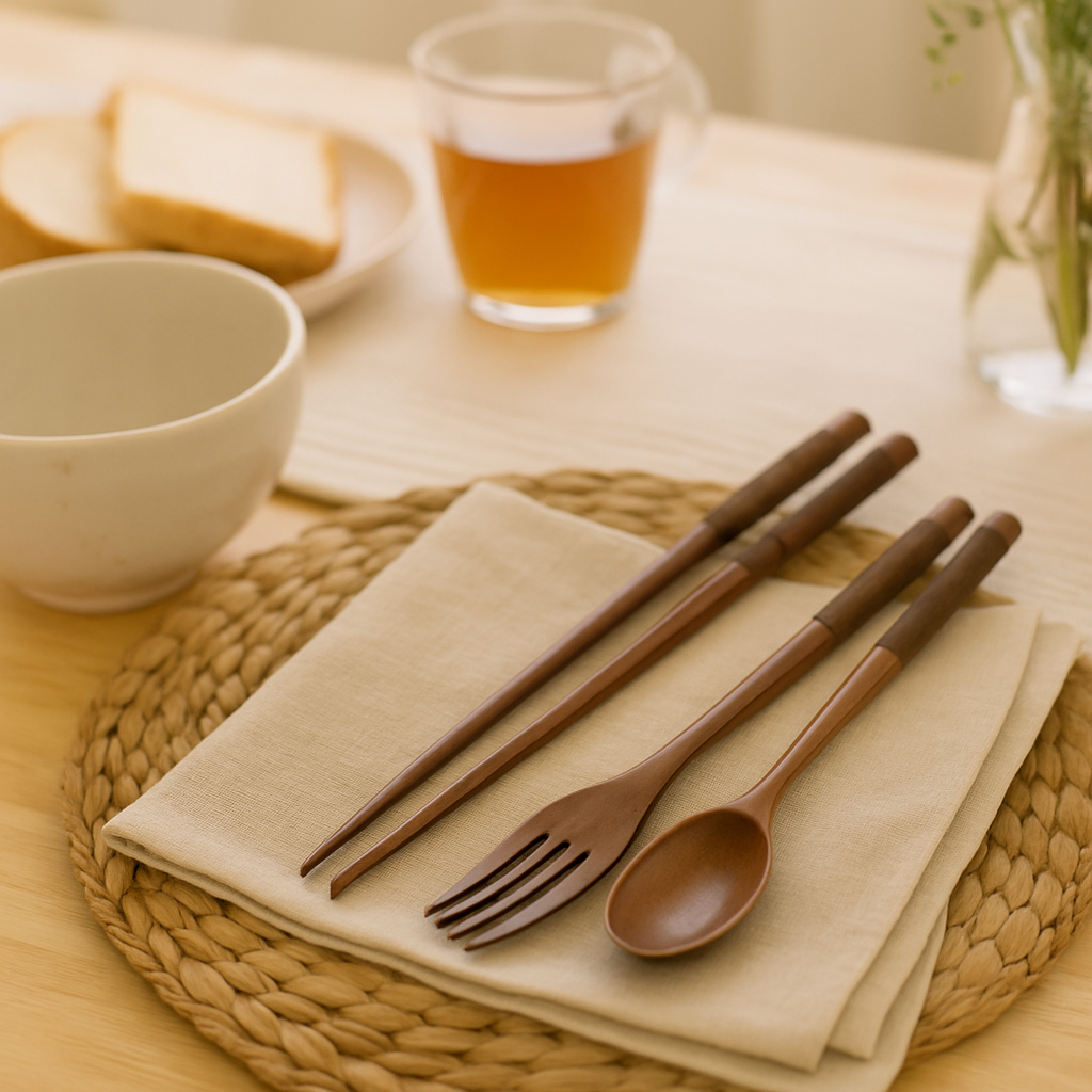 • Handgefertigtes Holzset: Enthält Essstäbchen, Gabel und Löffel für vielseitige Mahlzeiten.