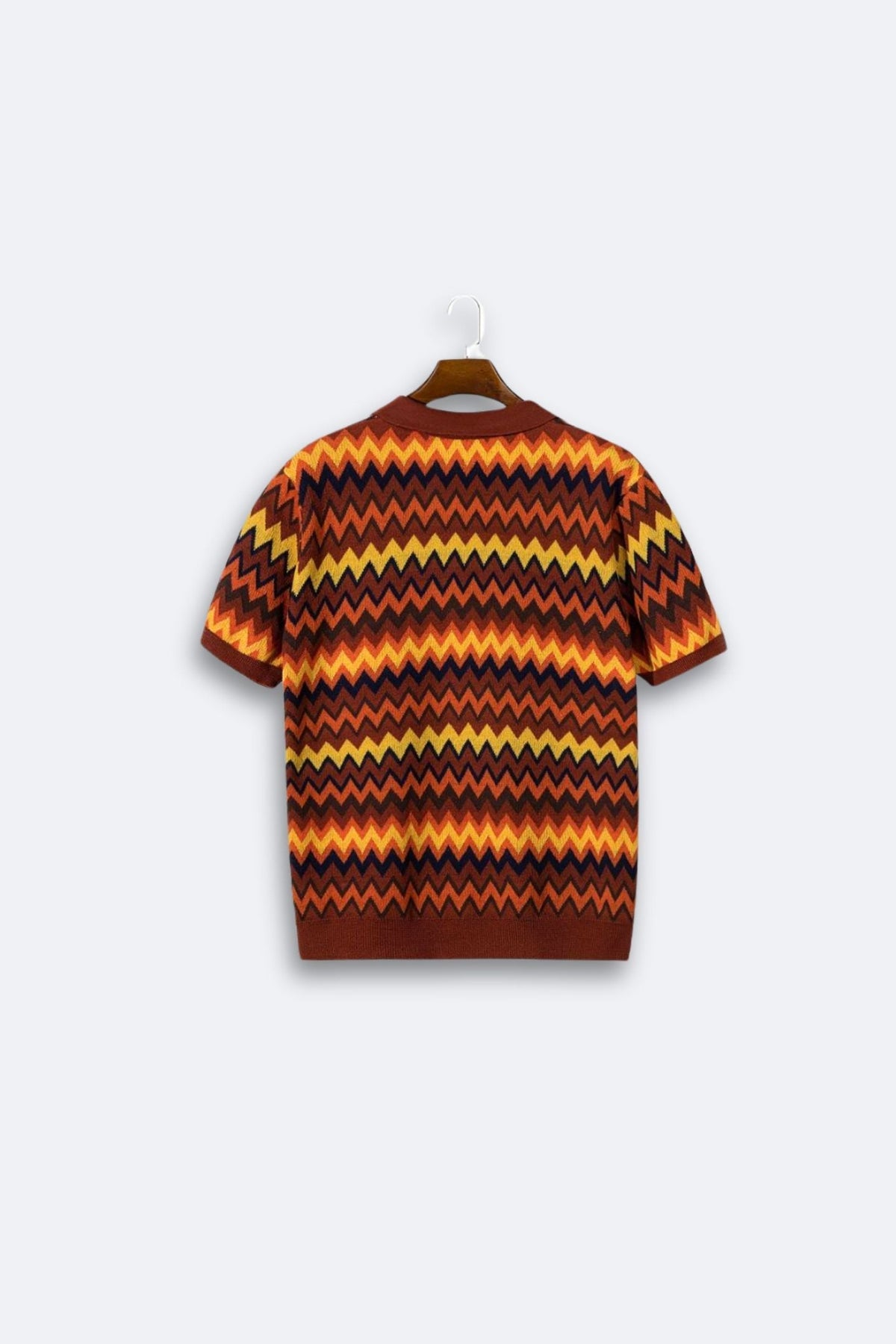 Bringe mit diesem einzigartigen Strickpolo im Retro-Design Farbe und Stil in deine Garderobe. Das auffällige Zickzack-Muster in warmen Farbtönen sorgt für einen stilvollen Vintage-Look, während der klassische Kragen mit V-Ausschnitt einen eleganten Touch verleiht. Perfekt für einen entspannten, aber modischen Auftritt.