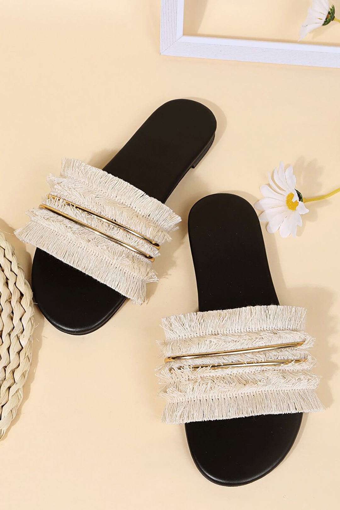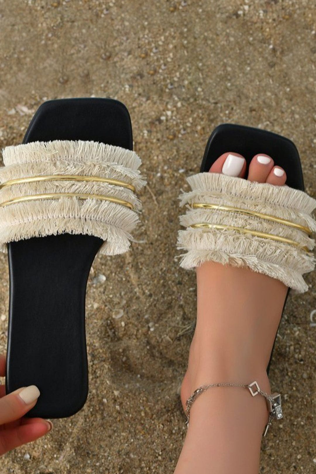 Diese modischen Slides kombinieren Komfort mit einem einzigartigen Boho-Chic-Design. Die schwarzen Sandalen sind mit dekorativen Fransen und goldfarbenen Akzenten verziert, die einen stilvollen und trendigen Look erzeugen. Perfekt für sommerliche Spaziergänge, den Urlaub oder entspannte Tage in der Stadt.