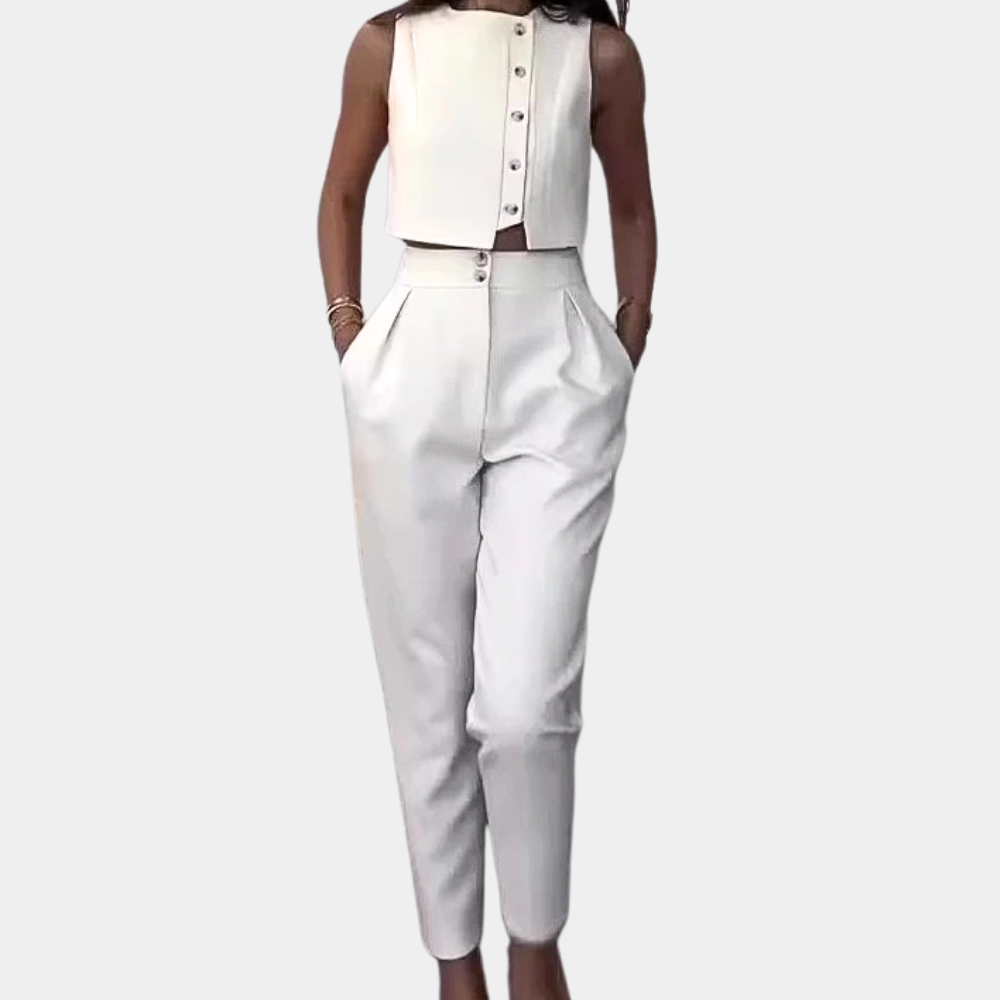Erleben Sie die perfekte Balance aus Raffinesse und modernem Stil in diesem atemberaubenden Outfit. Das Tatiana Set besteht aus einem ärmellosen Gilet mit Knopfverschluss, kombiniert mit einer Hose mit hoher Taille für einen Look, der sowohl stilvoll als auch modern ist.