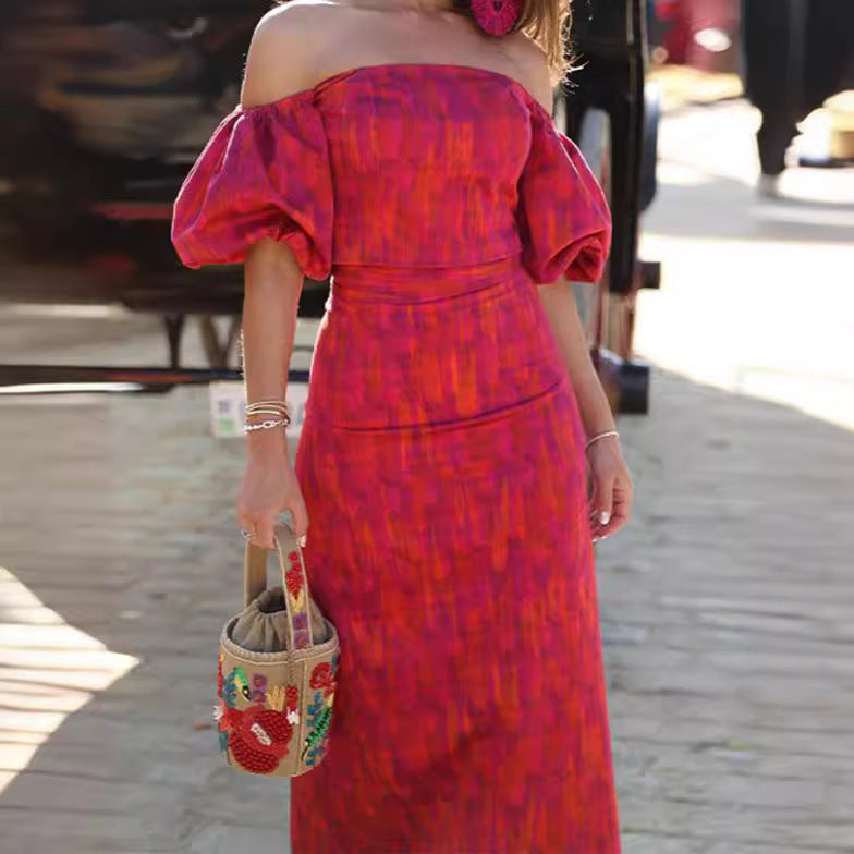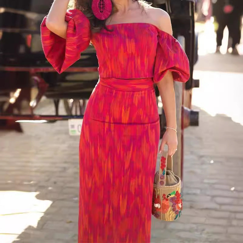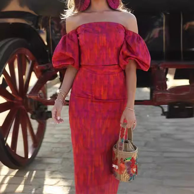 Shannon – Elegantes Bandeau-Ein-Schulter Puffärmel Top mit Midikleid-Set