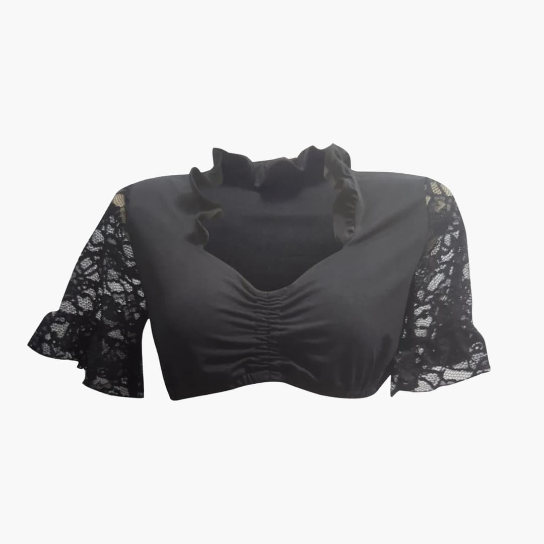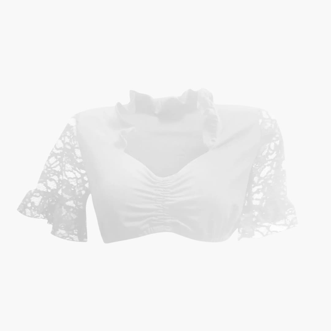 Diese kurze Dirndlbluse mit Spitzenärmeln vereint traditionelle Elemente mit feinen Akzenten. Sie ist speziell für Damen gestaltet, die eine festliche Ergänzung zu ihrem Dirndl suchen. Der halblange Spitzenärmel, das geraffte Brustteil und der geschwungene Ausschnitt verleihen ihr eine strukturierte und detailreiche Optik. Durch die elastischen Abschlüsse sitzt sie sicher und harmoniert mit verschiedenen traditionellen Outfits.