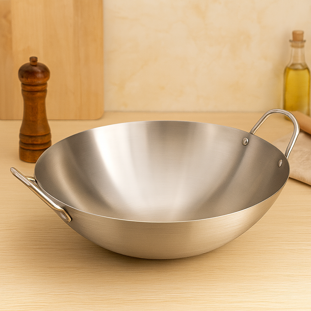 Dieser Edelstahlwok bietet Funktionalität und Langlebigkeit für professionelle sowie häusliche Küchen. Mit tiefem Design und stabilen Doppelgriffen gewährleistet er sicheren Halt und vielseitige Kochergebnisse für unterschiedliche Gerichte.