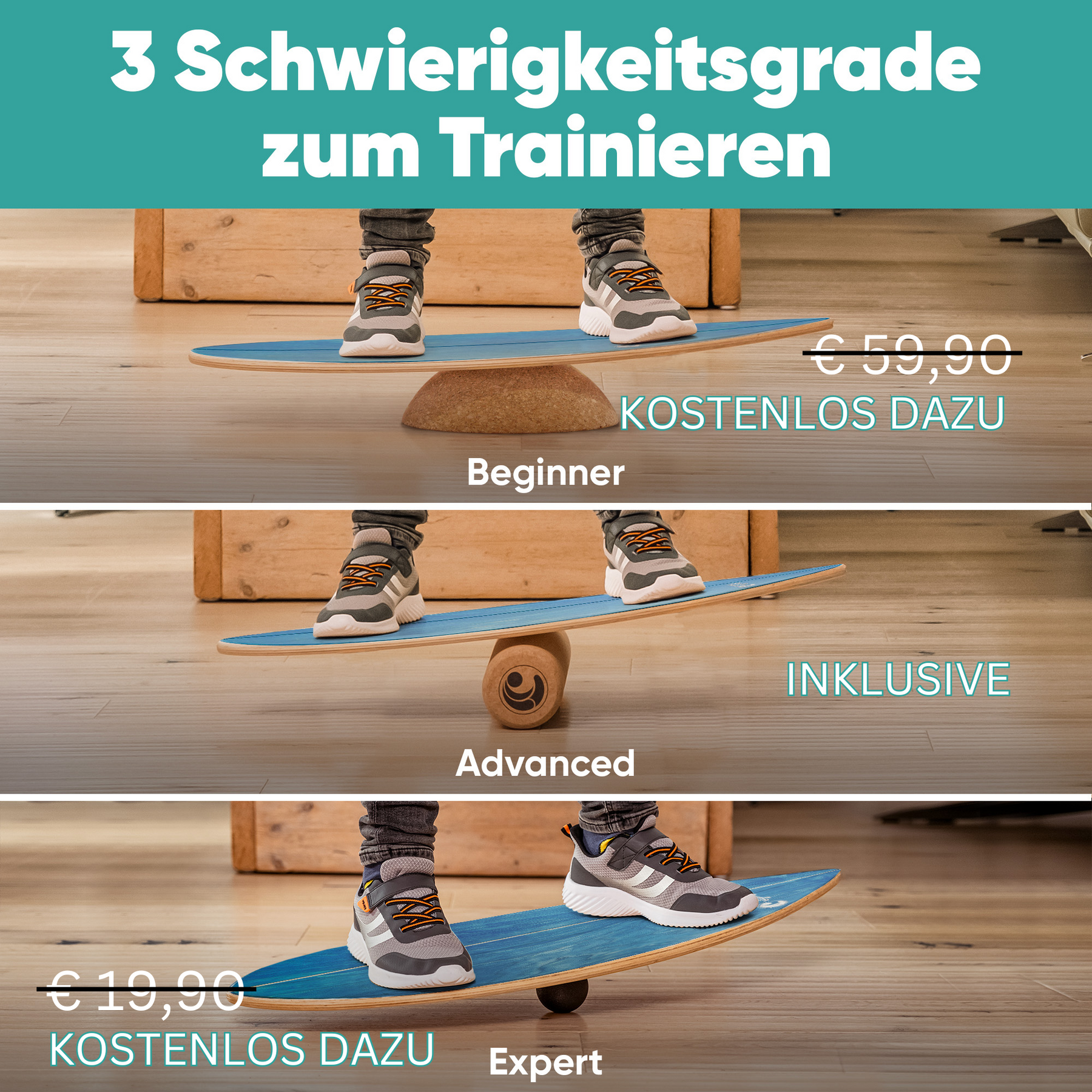 • Materialien: Balance Board aus 100 % Echtholz, Halbkugel und Rolle aus 100 % Kork