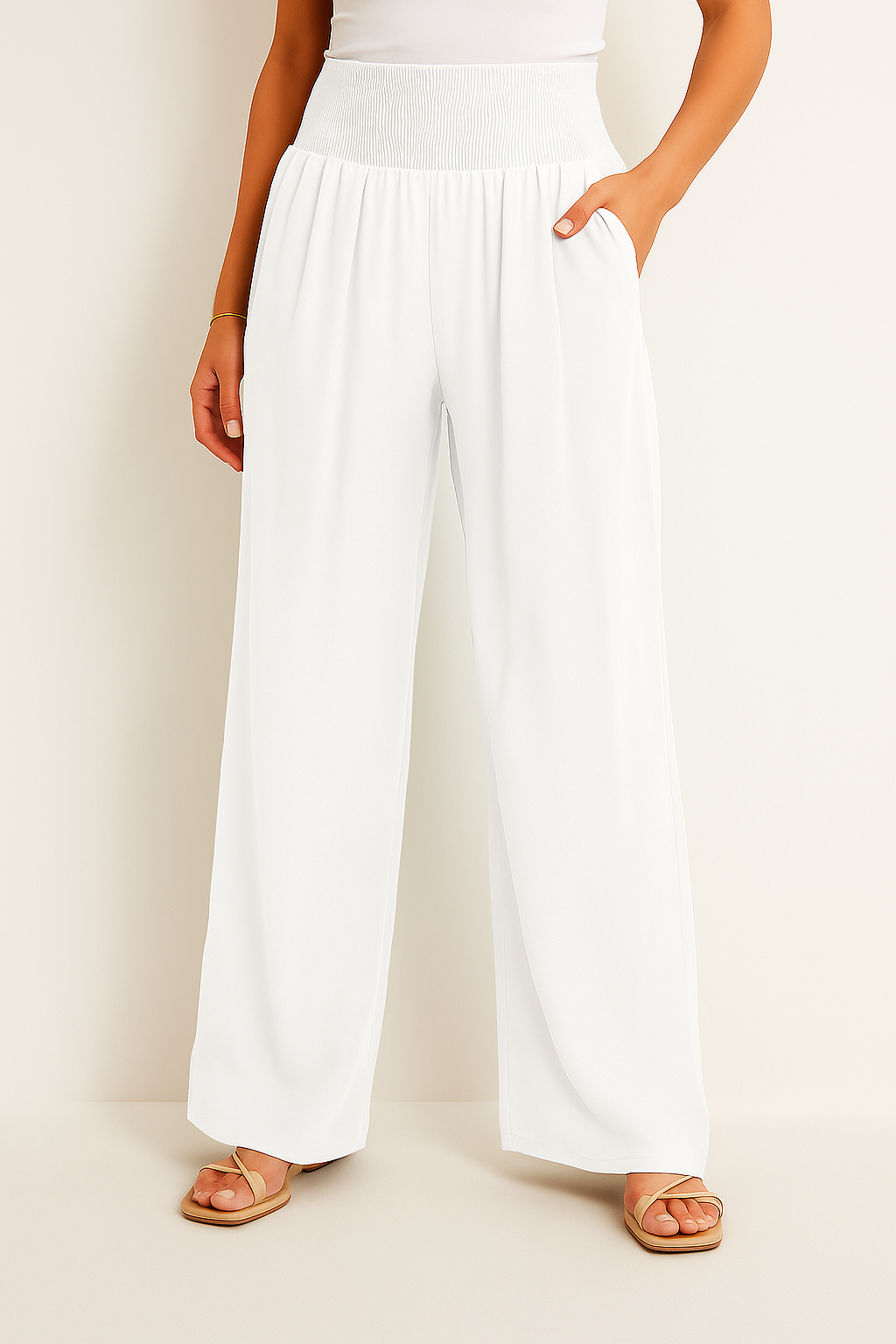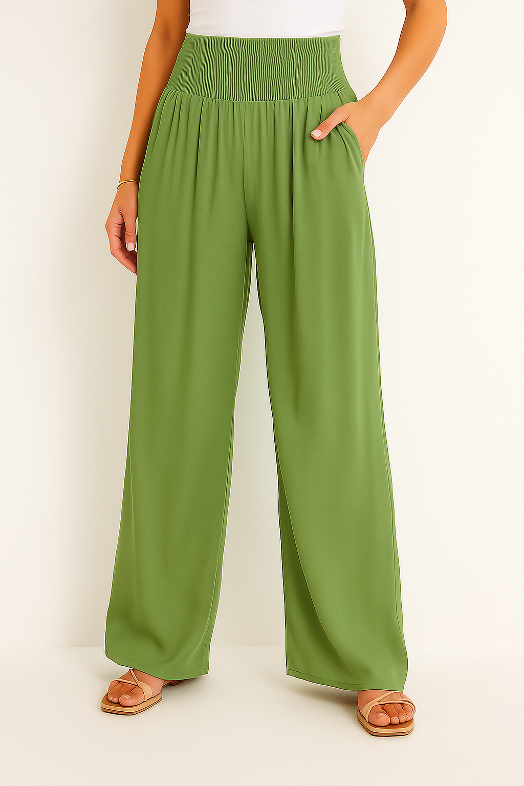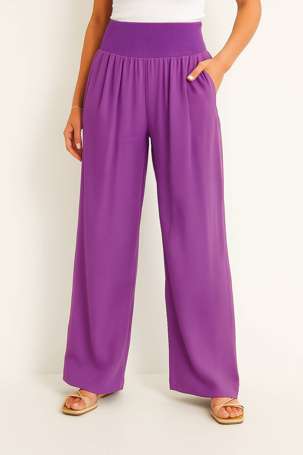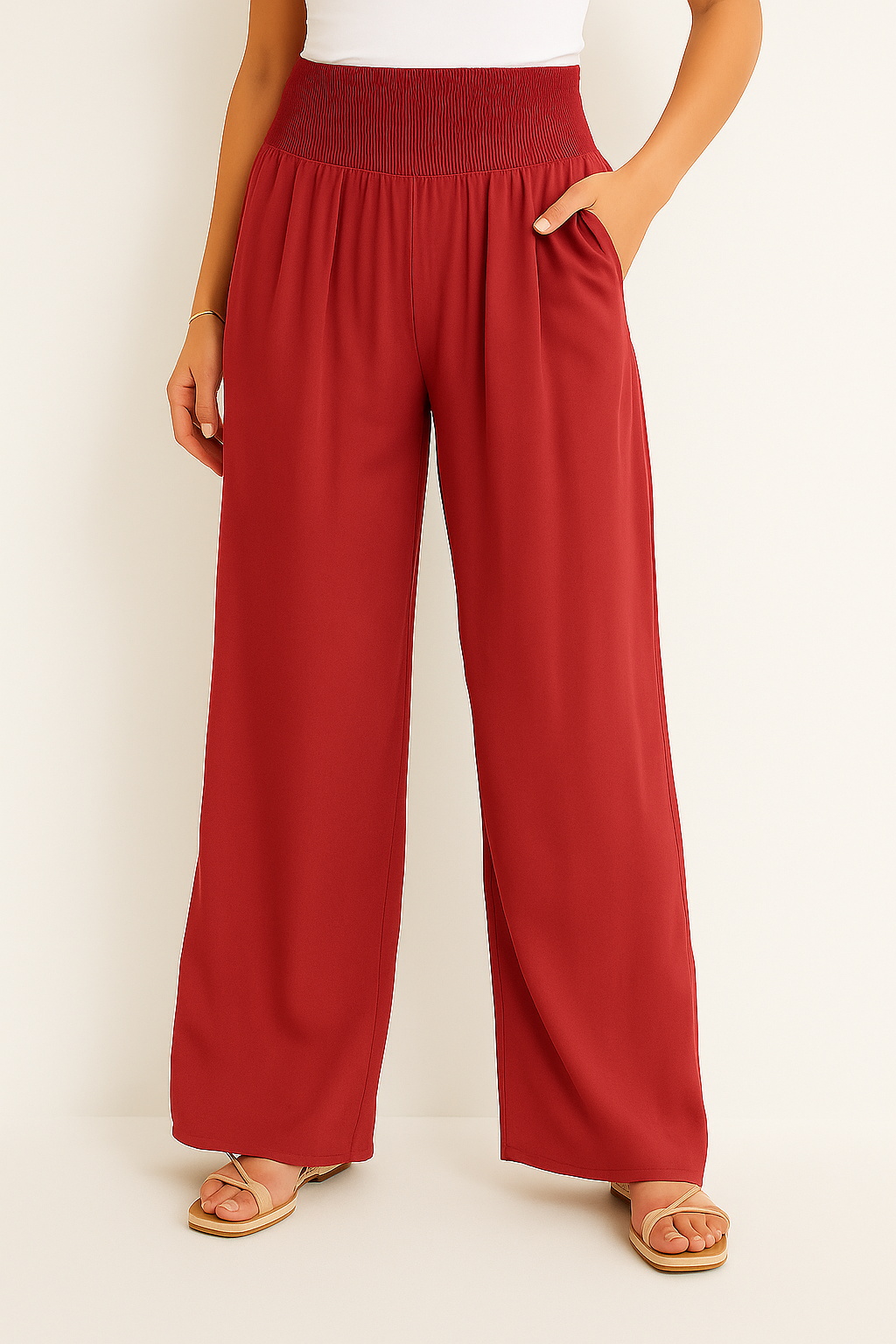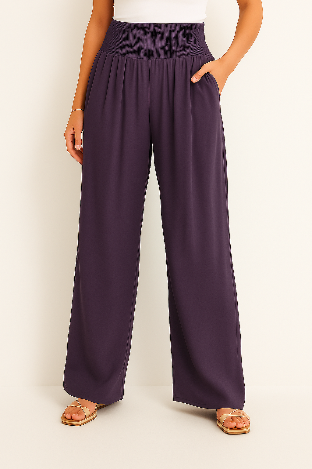 Diese luftige Hose ist wie gemacht für warme Tage, an denen Komfort und Stil gleichermaßen zählen. Der elastische High Waist Bund sorgt für eine flexible Passform, während das weite Bein eine elegante, fließende Silhouette zaubert. Ob am Strand, beim Stadtbummel oder im Urlaub, dieses Modell lässt sich mühelos kombinieren und begleitet dich durch jeden sommerlichen Anlass.